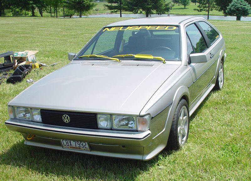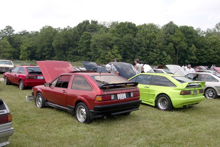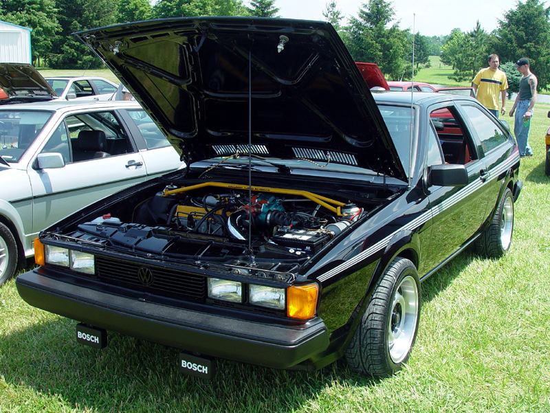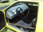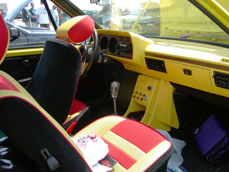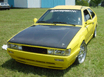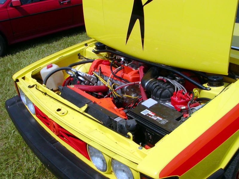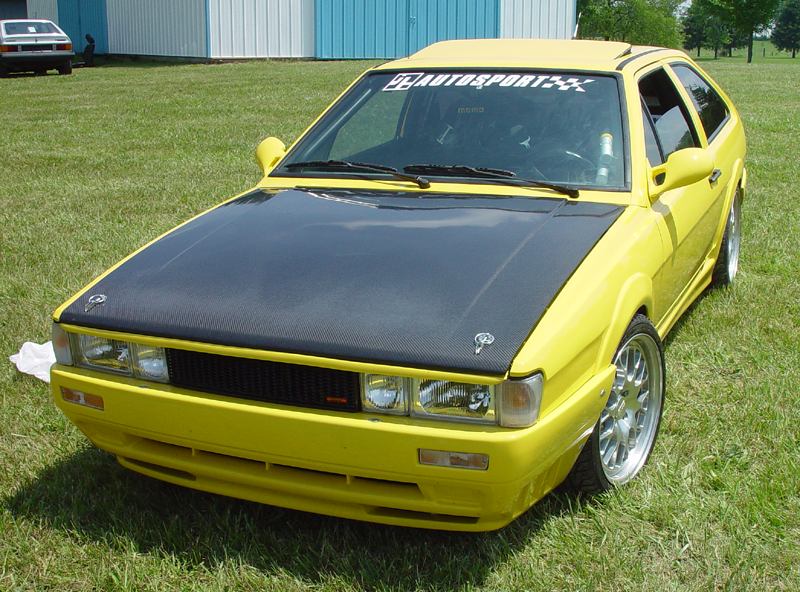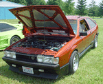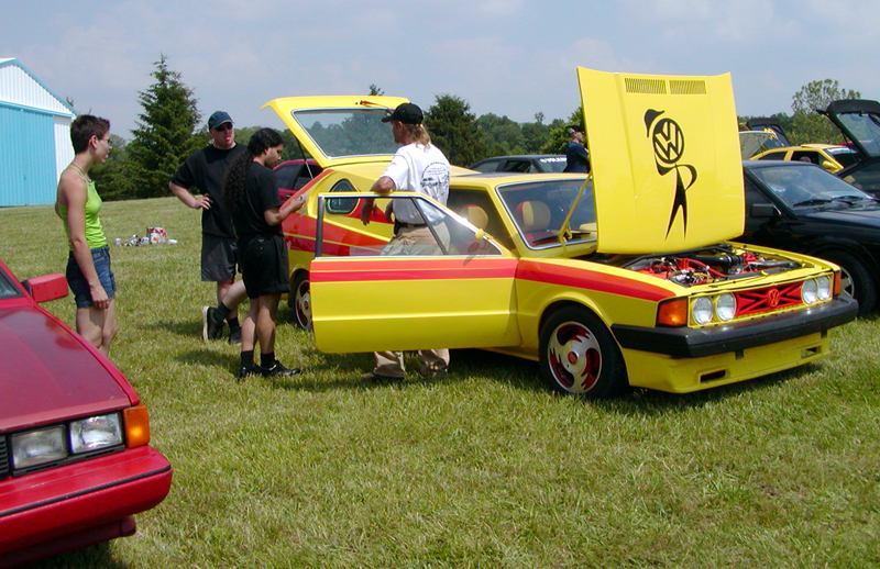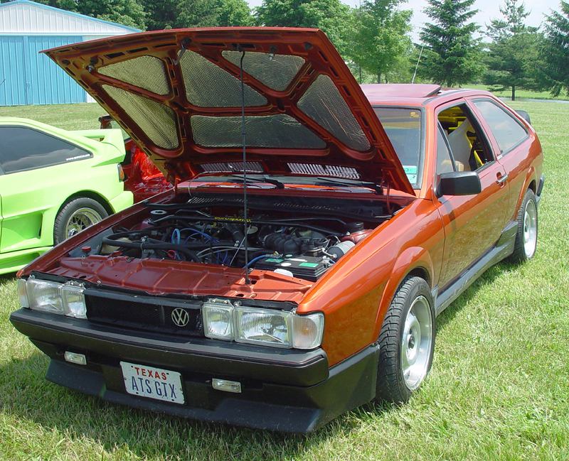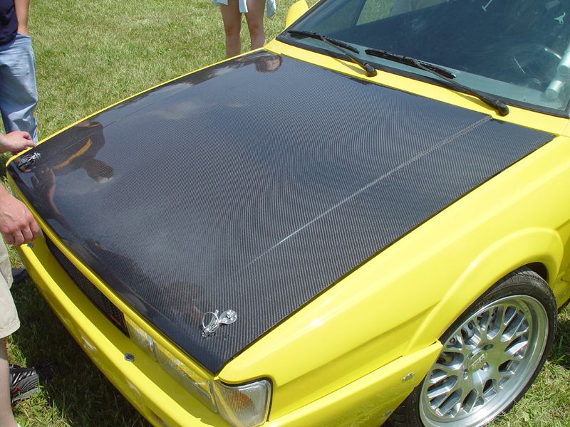 Patrick and Allyns car. Close on Patrick's car, cool off-center VW emblem grill and full Kamei kit are just a couple of the nice features. Very interesting ride Patrick! One of only a handful of silver colored cars here. Angie's car, finally found another ATS 6 spoke rim, yeah! The famous Uncle Rocco factory Callaway turbo... ...A rare ride (1 of 10 or so) owned by Steve Szuba, with many Callaway parts. Great as usual! Anyone have an exact match for this cloth pattern? Steve is looking. Lowell Snow's very custom remade Scircco Mk1 truck-like thingy... Even the hood flips up in a very interesting way... Nothing says 70's like neon. Looks cool lit up at night. :-) It even has another engine, air cooled too! Wicked interior too, hyper yellow I might add... I think the orange is a stock color... :-) Check out those hinges! Lowell with his creation. Scott Kraus's redone freshly painted Seidl & Reiger bodied Roc. Rims are by Fiske. Nice exterior package. Carbon fiber hood hides individual throttle bodies on a 2.1L 16v. Quite a custom dash, note cage also. Scott Kraus reaching for a refreshment. :-) There has been problems with CF Scirocco hoods in the past, but this one looks great! Close on motor, note ITBs, yum. Custom front upper reinforcement is very serious looking. Through the interior shot Underside of CF hood on Scotts car. |