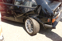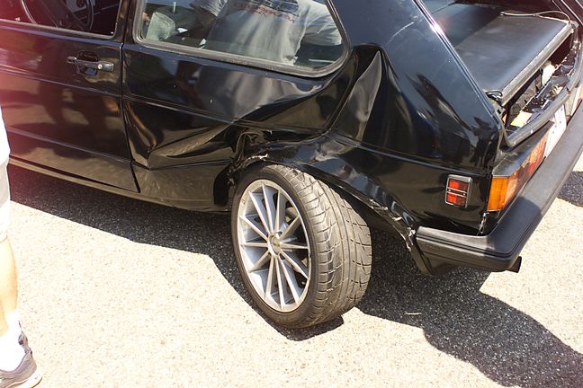 sideswiped the car...twisted the back wheel almost off. OUCH.