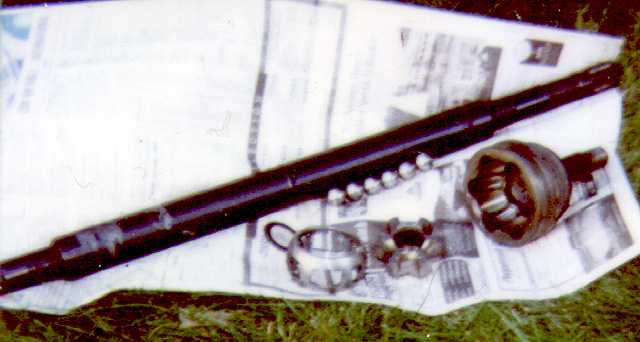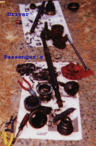 Ok here's what you should have now - all the joints off the shafts, and lots of grease and dirt around! At this point, take a deep breath - the worst is over :) You can now disassemble the joints themselves (unless you're replacing them with new ones) and soak the inner and outer races and the bearings in the parts cleaner. Disassembly of the CV's is kind of like doing a Rubik's cube, but not nearly as tough. Try to remember how it came apart, so that putting it back together will be easier! Also clean off the drive shafts and any other parts you'll be reusing.