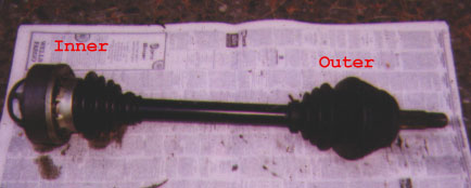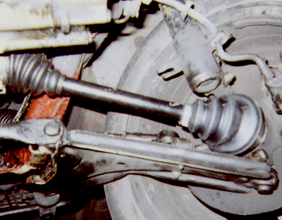 This photo shows my driver's side drive shaft before the operation. Note the ripped outer CV joint boot. Yuck! Also note that even though my wheel is off in this photo, I ended up putting it right back on a short while later.