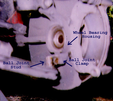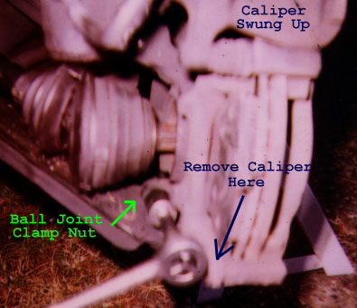 This photo shows the outer joint (complete with ripped boot), partly removed from the wheel bearing housing. I wasn't able to get it completely free without also removing the ball joint. To make this job easier, I swung the brake caliper up out the way. Just put a socket (mine was 1/2") on the lower caliper nut, and some vice grips on the "nut" next to that little boot inside the caliper and loosen. Leave the top of the caliper fastened, and you can swing it up out of the way. Take the brake pads out while you're at it, because they'll probably fall out anyway. Now you can loosen the nut that holds the ball joint clamp tight. Bentley says that you can remove the joint after loosening this nut, but I found it necessary to remove both the clamping nut and its bolt completely. Now take your rubber hammer and pound the control arm down until the ball joint stud slips free of the wheel bearing housing.