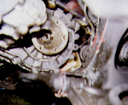 Now it's time for the wheel to come off. Also, remove the axle nut completely, along with the washer behind it, and throw them into the parts cleaner. The next thing to do is to get the outer joint out of the wheel bearing housing so that the entire assembly (joints and shaft) can be removed from the car. Now I've heard that it's possible to do this simply by turning the wheel all the way to the left (if you're doing the driver's side), and pushing the inner CV joint up into the tranny, while pulling the outer joint free of the wheel. You're welcome to try this method, but I found it a lot easier to do this after removing the ball joint. This allows the wheel bearing housing to be pushed out enough to allow the splined shaft of the outer joint to clear without any trouble.