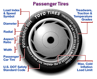 | The graphic at the right dissects a tire sidewall quite nicely. Treadware, Traction and Temperature ratings of less then 'A' probably are not desirable, and I doubt any recent performance tire does not meet those specifications. | What